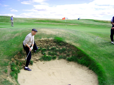 On day two we journeyed to the Gallane Golf Club and played their #1 course. That's the name of the golf course, Gallane #1. This was a wide-open links course and like all the golf courses in Scotland, it was well bunkered. On one of the holes I had a very unusual bunker shot. I drove my ball into the back wall and it stayed there. Fortunately there was a local rule that if that happened I could drop back of the bunker without penalty for my next shot.