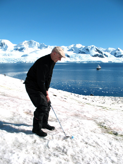 I am kicking off this journal entry with a photo of myself addressing a blue Volvik crystal golf ball (THERE ARE 10 COLORS) www.volvikgolfballs.com with a 4-in-One gap wedge loaned to me by Short Game Travel Clubs, Inc. www.shortgametravelclubs.com. The site is the frozen mountainside of Atcho Island in Antarctica. My writing is usually about golf and this one will be too. It is about the evolution of Senior Friendly Golf since 2003 and what we are all about today.