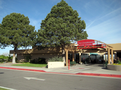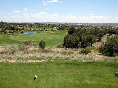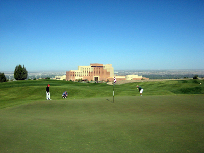 Our golf tour continued with a long drive to Albuquerque where we hit the Santa Fe Golf Trail. We arrived in plenty of time to rest up for our next challenge, Paa-Ko Ridge in Sandia Park, which is located on the east side of Sandia Peak in the Sandia mountains. The weather forecast was 74 degrees and windy. This day was a little warmer than in Farmington, but the wind was so strong it actually blew me over as I teed off on the picturesque number 16. This hole is the signature hole of the second nine holes. Paa-Ko Ridge has three nines and their numbering is unusual. In 2004 I reviewed the "Golf the Santa Fe Tail" and the course's third nine was under construction. (See ARCHIVES October 16, 2004 ON THE SANTA FE GOLF TRAIL for the 2004 review) What is unusual about the three courses is that they are numbered one through 27 and not three one through nines. We had planned to play 18 holes, but the course was so beautiful we had to go the full 27. CLICK HERE to see the review of Paa-ko Ridge Golf Club.