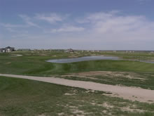 Fairways are narrow, but the rough is playable, and there are no significant tree or brush problems. The fairways feature rolling and slanting configurations. You might even encounter antelopes and large jackrabbits. This is not a flat course, and there are a couple of holes that will surprise you with hidden hazards. Like number 11, a five par with a switch back ditch that will catch a long second shot trying to reach the green in two. Number five, a four par, will take a super long drive right down into a ditch that is invisible from the tee. The fairway appears to have some slant, but when you get up to the 150-yard marker the slant becomes severe and will shoot the ball into the hazard. There is a bunker guarding half of the green and a severe up slope bank behind the green. That can be good if you shoot over the green. The green itself has the most aggressive undulation on the course. This hole is a real challenge, although it is only rated as the #5 handicap hole. 150 yard markers are visible, as are all greens or flags, from the tees.
