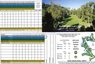 I don't know who said "a photo is worth a thousand words," but in the case of the Buffalo Hills Golf Club, this is certainly true. It's worth the price of admission just to cart around the course much less play it. I give this course a provisional rating of SFG-5.5 (click here for information about SFG ratings) because of the many challenges it provides. There are many elevations and blind holes and the greens require an astute eye to conquer. Of all the courses I have played in Montana this is my favorite. Many of the holes and views will leave you in a state of awe. The uniqueness of this golf course is almost a distraction in itself. Only one other comes to mind that might challenge it and that is the Paa-Ko Ridge course on the Santa Fe Golf Trail near Albuquerque, New Mexico (see journal entry #40 in ARCHIVES).