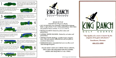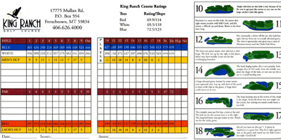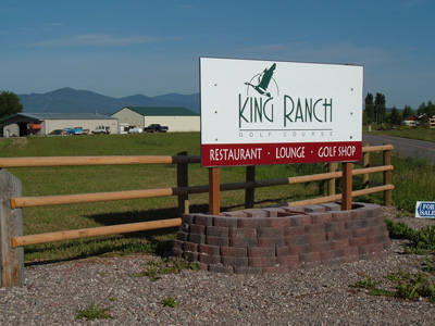Just west of Missoula is Frenchtown and that's where the King Ranch golf course is located. Now days it is said that a new golf course is opened each day in our country. Many companies with familiar names, like Nicklaus, Pete Dye, etc. etc, design those golf courses. Not so for the King Ranch golf course. It was built by Bud King and his family and friends back in 1991 and opened in 1992 as a nine-hole venue. In 1997 the Ockler family, Frenchtown residents, bought the course and in 1999 its second nine was opened. The back nine was designed by former golf professional Greg Vannetta. The course covers about 270 acres of the Clark Fork River Valley and is bordered by farmland and a wildlife refuge.